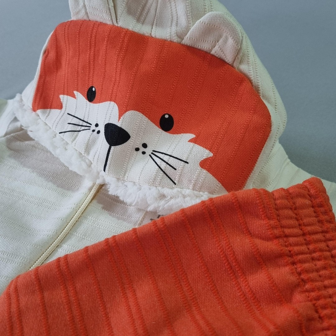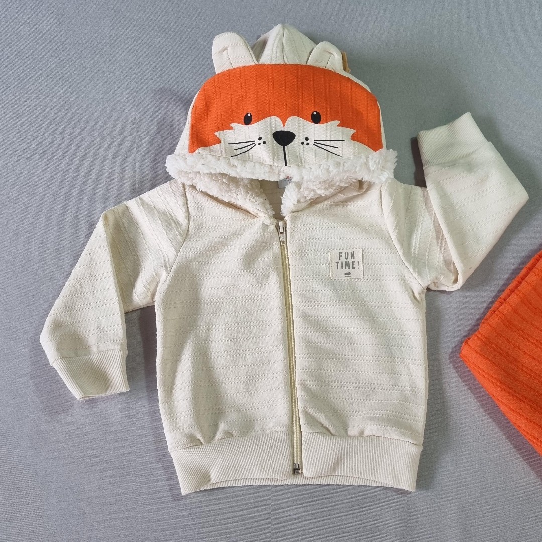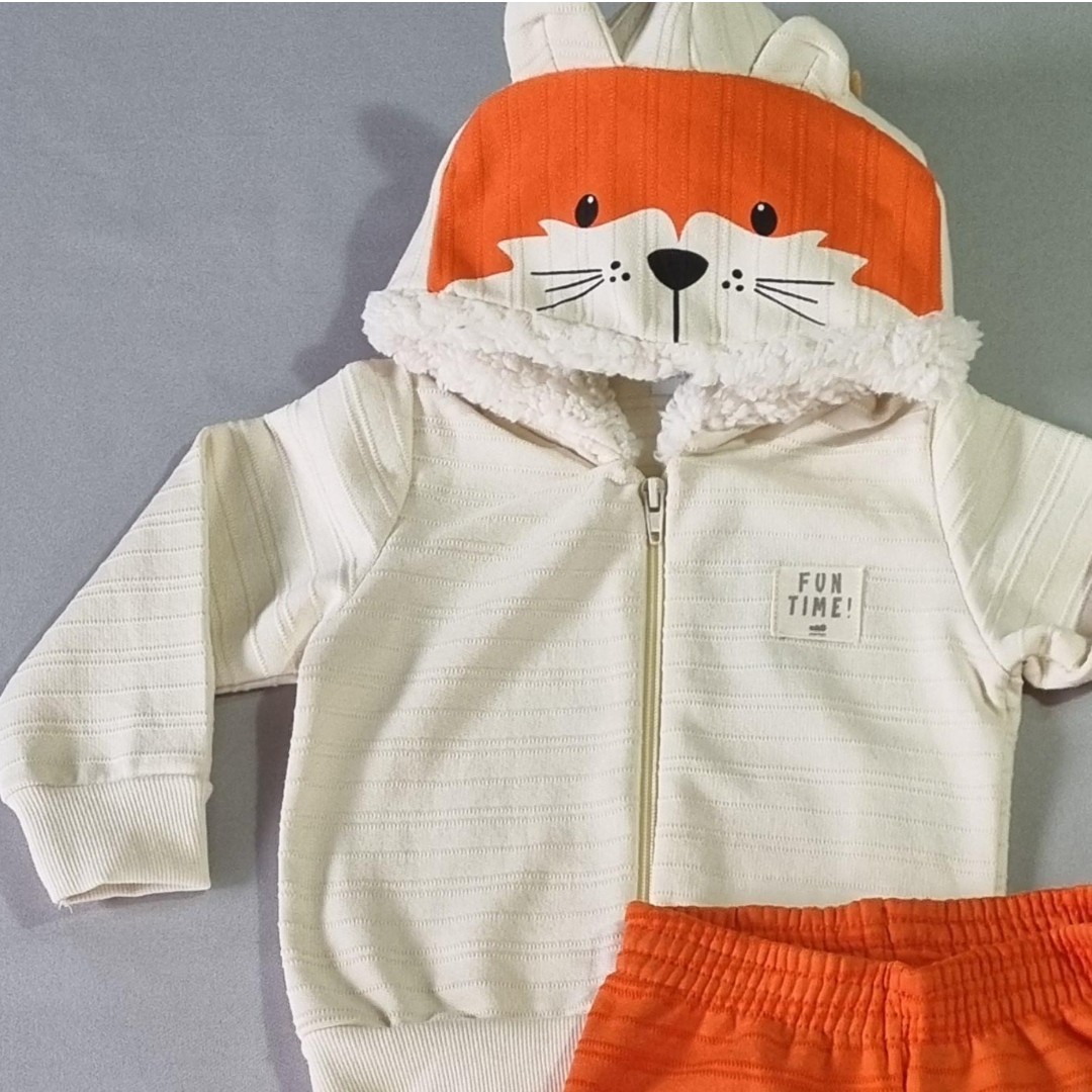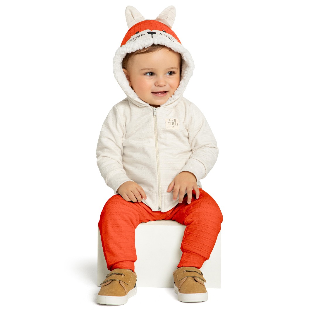 🧡 A jaqueta com capuz em formato de raposinha conquista à primeira vista! Com orelhinhas, carinha estampada e forro peluciado por dentro, ela abraça como um cobertor quentinho. A cor marfim traz suavidade e combina perfeitamente com a calça laranja vibrante.