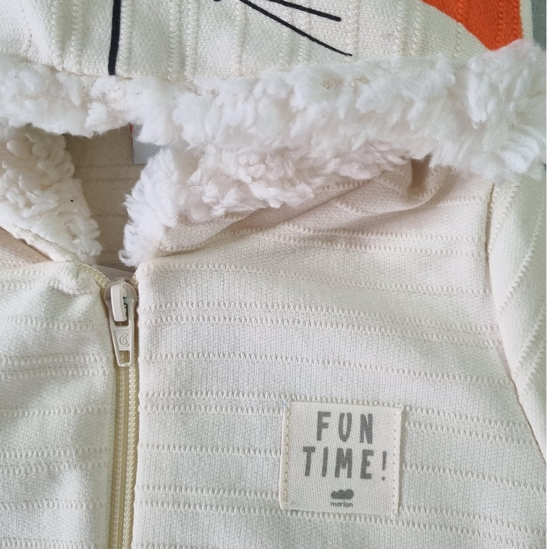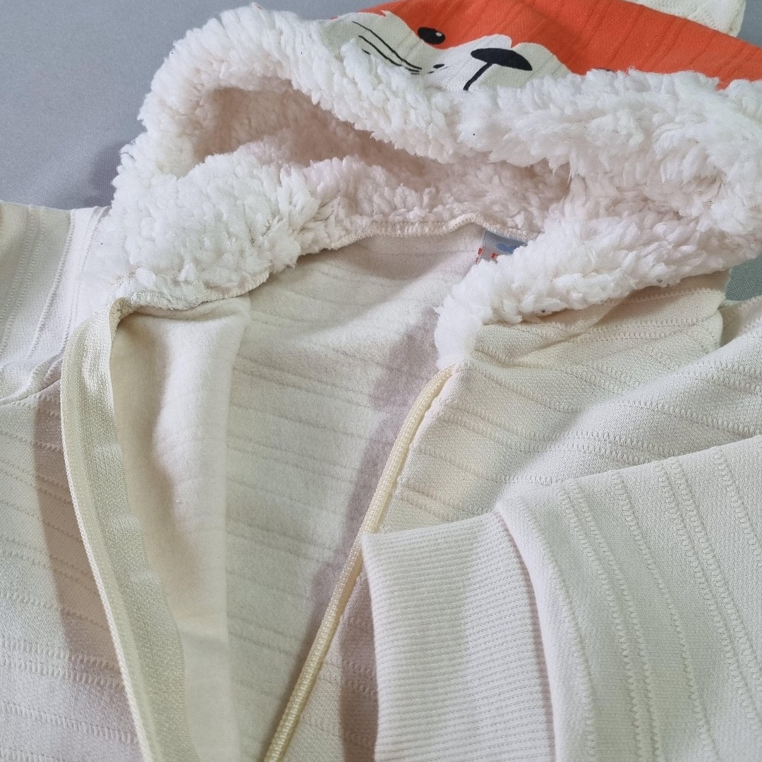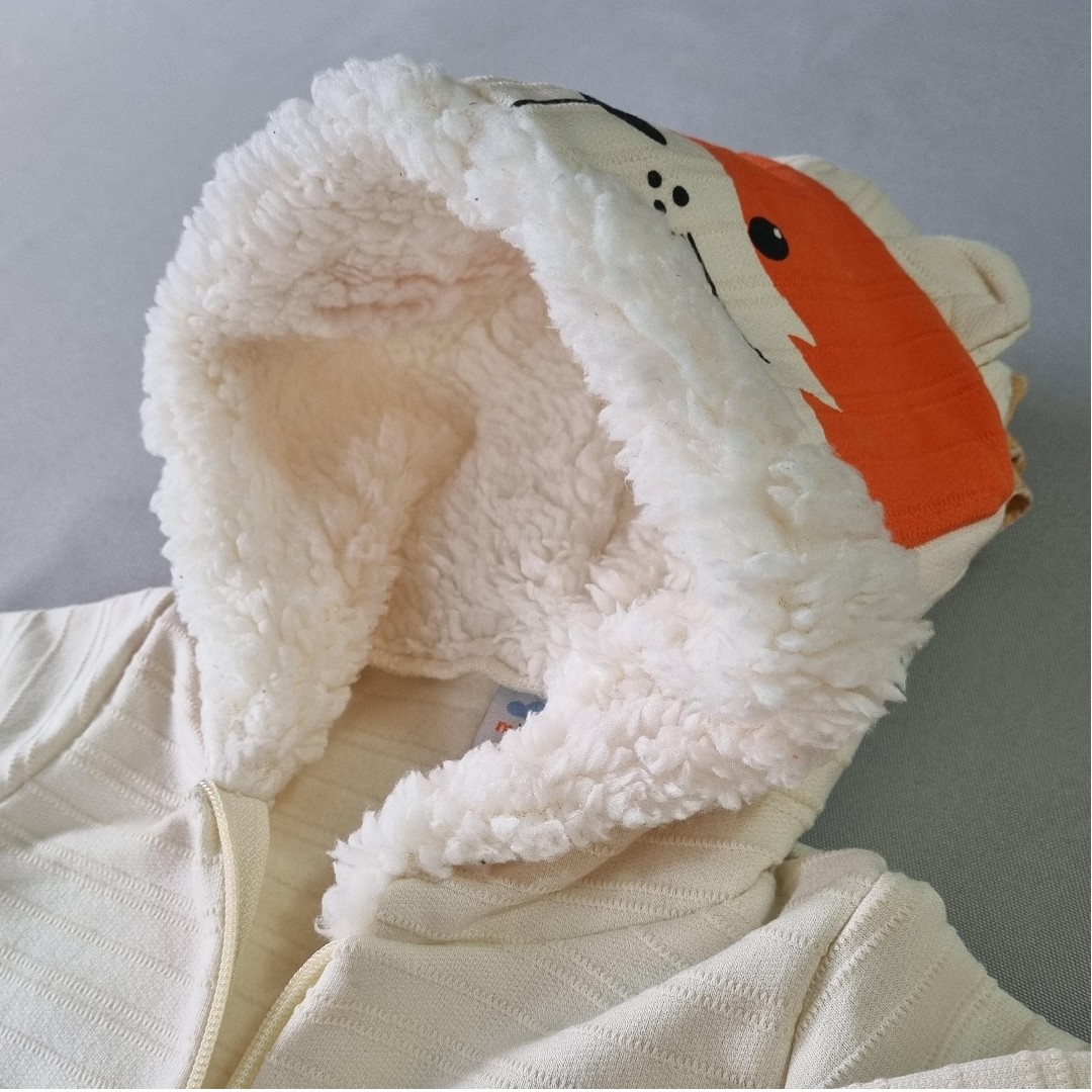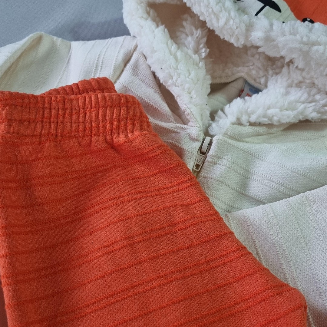 🧡 A jaqueta com capuz em formato de raposinha conquista à primeira vista! Com orelhinhas, carinha estampada e forro peluciado por dentro, ela abraça como um cobertor quentinho. A cor marfim traz suavidade e combina perfeitamente com a calça laranja vibrante.